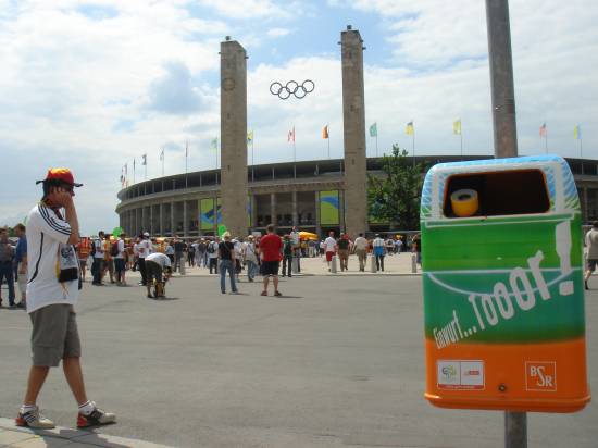 olympiastadion berlin. viele leute aber überhaupt kein gedränge oder anstellen. rechts der mülleimer im wm design