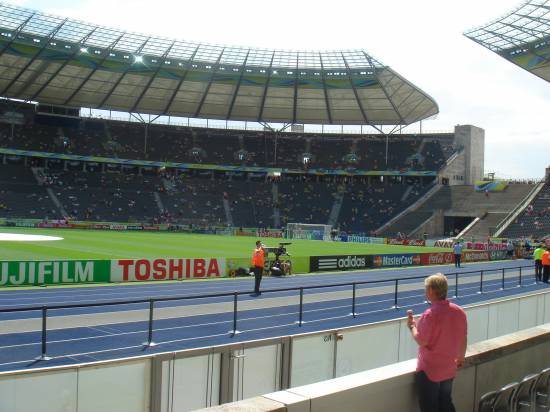 fifa fest fest münchen - man beachte das fussballfeld am hügel im hintergrund!italien - tschechien. es waren natürlich fans von beiden vor ortim hintergrund das olympiastadionnicht das einzige haus mit einer deutschland flagge in fenster. patriotismusbekundungen fast wie in amerika!diese fähnchen waren zeitweise ausverkauft und wurden während der wm immer teurer udn teurerinnovativ: wechselgeld fix eingeschweisstam abend schauten wir uns noch das gruppenfinale mit kroation - australien und japan - brasilien anauch auf der flughafenanzeigetafel kam man an den fussballergebnissen nicht vorbei!flugahfen berlin schönefeld. sieht alt aus und wird auch bald abgerissen für den neune flughafen BBI - berlin brandenburg internationalmein lieblingsfernsehturm im magenta-fussball-designplakat an unserer ubhan stationtürkischer markt in kreuzbergkreuzberger preise: kaum zu glauben,  ganze pissa ab 3 eurounser kleiner berlin rundgang führte am checkpoint charlie vorbeiam potsdamer platz. das gebaüde in der mitte existiert noch gar nicht, es ist nur eine plakatwand!potsdamer platz, links deutsche bahn headquarterolympiastadion berlin. viele leute aber überhaupt kein gedränge oder anstellen. rechts der mülleimer im wm designdas stadion füllt sich langsamaussenansichtwenner so weiter macht verschläft er das spielunsere reisegruppe mit lok jochberg t-shirtses spielen: tunesiengegen ukrainegegnerische fans nebeneinanderdie nationalhymnen erklingenund dann gehts loshab versucht ein paar spielszenen einzufangen. ging ganz gut von der vierten reihe ausein schönes stadion übrigensobligatorisches beweisfotospielszene. es ging übrigens 1:0 für ukraine aus durch einen elfmeterdie ukrainerInnen konnten den einzug ins achtelfinale feiernlangsam wirds leer. gut zu sehen hier die blaue laufbahn, die natürlich nicht optimal für ein fussballstadion istnach dem spiel spieltlen wir selber noch ne runde mit ein paar italienernim brandneuen berliner hauptbahnhof. im hintergrund das bundeskanzleramt und auch das sony center am potsdamer platz kann man sehenes ist wirklich ein beeindruckender kreuzungsbahnhof mit vielen etagenspreeufer mit fernsehturm im hintergrundso dieht der bahnhof von aussen aus. rechts gehts richtung alexamderplatz, links zum tiergarten und bahnhof zoosonne geht bald unterpolizei kam auch beritten daherdie allerletzten gruppenspiele schauten wir uns in einer bar an der spree anso sah das von aussen austypisch berlin: mitten auf einem freien platz wurde sand aufgeschüttet und ein bar aufgebaut. leider wars um schon ziemlich verlassen dortlinks adidas mini olympiastadion, rechts bundeskanzelramt. hinter mir wäre der bundestagbrandenburger tordieser fussball tourte durch deutschland vor der wm. drinnen eine art fussball austellungdas ist das relativ neue stehlenfeld, das ziemlich umstrittene holocaust denkmalmittendrin im stehlenfeld. darunter befindet sich eine austellung zum holocaustpotsdamer platz im wandel der zeitwieder mal ein schwarz-rot-gold dekoriertes autohier spielen grad die sportfreunde stiller im zdf studio in sony center am potsdamer platzauf der fanmeile. hinter die siegessäulefahnen am screen und vor unsdas fahnen meer verrät: deutschland spielt. gegen schweden im achtelfinale. und gewinntschloss bellevue mit dem schönsten und dichtesten rasen den ich je gesehen hab. man traute sich fast nicht sich draufzusitzendas zweite achtelfinale schauten wir dann im gastgarten vorm tränenpalast (u/sbahn friedrichstrasse, also auf der ex ost-west grenze)zum wm wurda mal schnell ein deutschland cocktail kreiertscreen vorm tränenpalastwar gar nicht schlecht das teilaus der serie wm überall: brottütedas war unsere unterkunft: riverside lodge in berlin kreuzberg. empfehlenswert!fussballfeld am flughafen berlin schönefeldjetzt gehts wieder heimund einmal gehts noch mit fussball schauen: in roberts haus in münchen mit notebook und dvb-t