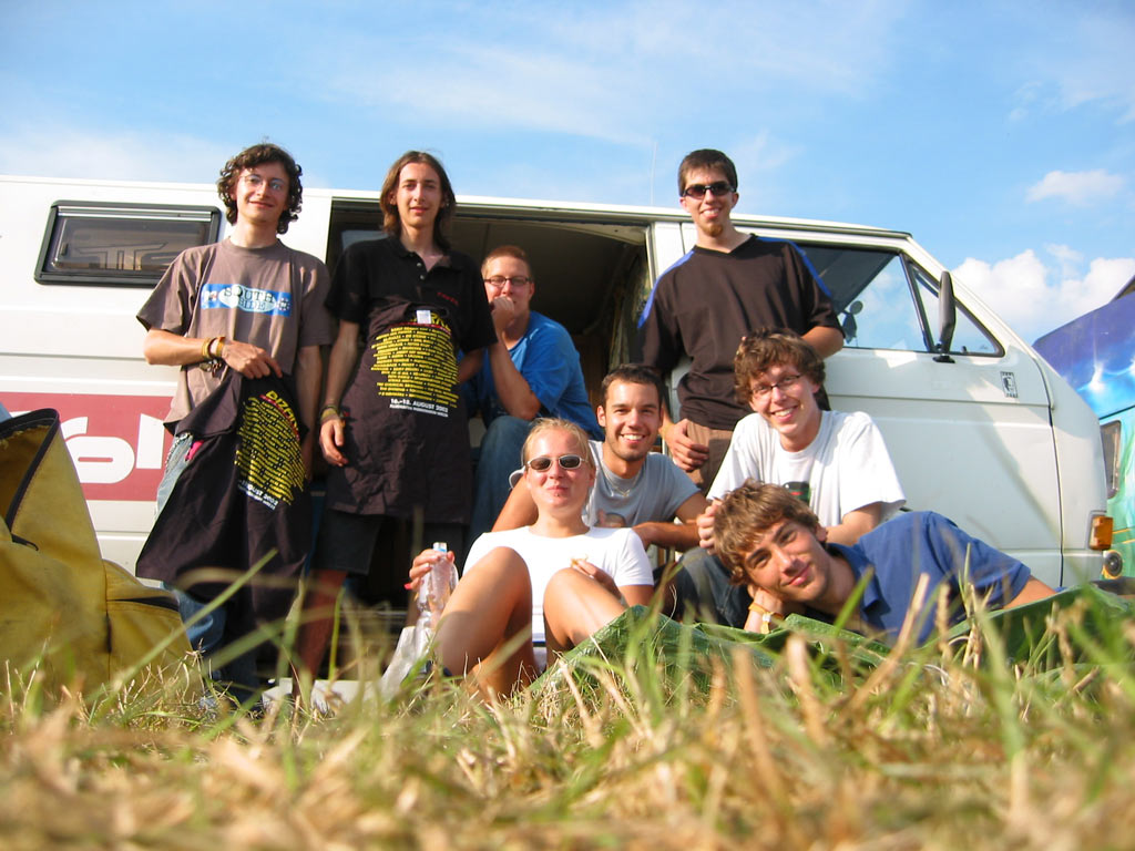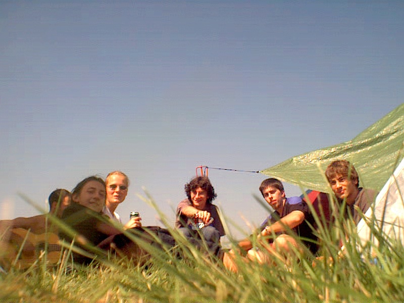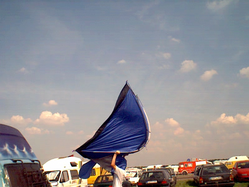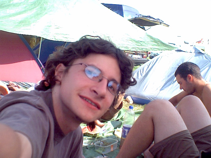 -enlarge- -full size- unser lager: als basis diente marcos bus und raborts plane |  -enlarge- -full size- vor telepopmusik, eins meiner berühmt-berüchtigten selbstauslöser-fotos. über uns der hangar, die second stage, an diesem tag electronic music stage |