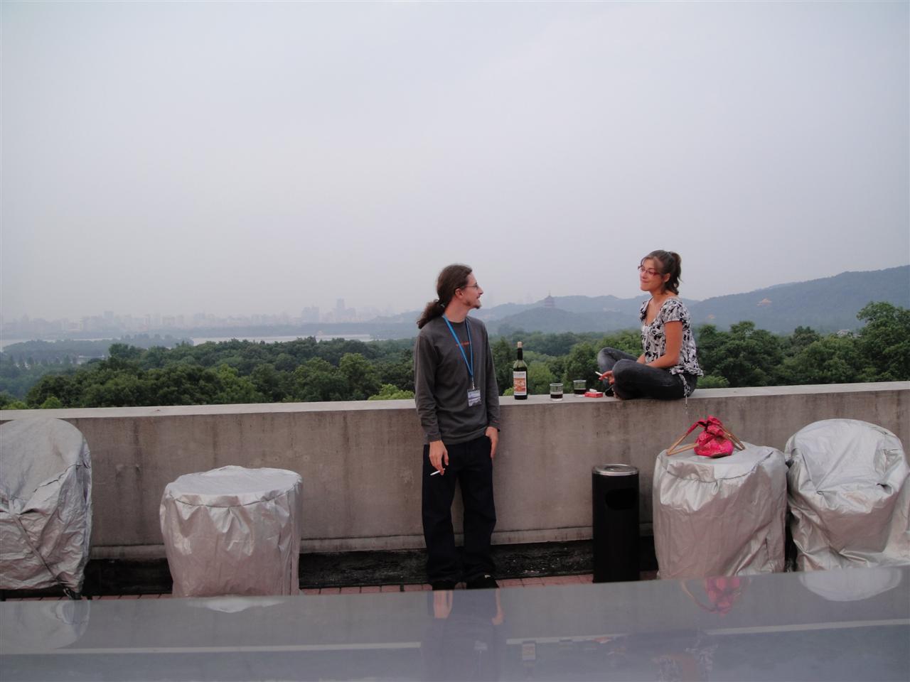 | .JPG) -enlarge- -full size- wein auf der hotel viewing platform mit blick über den west lake auf die skyline von hangzhou |