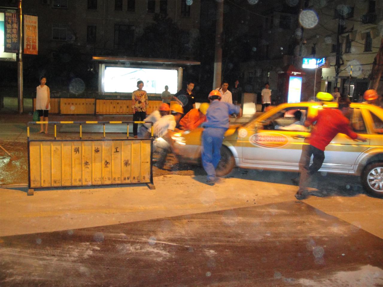 .JPG) -enlarge- -full size- hier fuhr eine taxifahrerin in den frischen beton. nicht ungewöhnlich wenn man deren fahrstil kennt. im foto wird sie grad unter lautem rufen von den bauarbeitern rausgeschoben | .JPG) -enlarge- -full size-