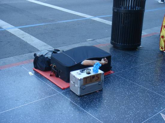 images > 2006 > san_diegotjs, die usa... immer wieder eine reise wert muss ich sagen! im vergleich zum letzten trip war diesmal viel mehr landschaft und natur dabei ohne auf grosse städte zu verzichten. als hochhaus fan (wie ich) kommt man in new york sicher mehr auf seine kosten, aber das death valley und die ganze autofahrt war sehr beeindruckend. in kalifornien ist einfach teilweise dutzende meilen weit einfach nichts. kein ort, keine autobahnausfahrt, kein handyempfang und auch fast keine autos. sowas gibt es denke ich in mitteleuropa einfach nicht, zumindest nicht im flachen land. hier der originaltext von vor der reise: mein professor ist gerade auf der uni san diego und er holt sich natürlich auch qualifiziertes personal nach, z.b. mich und meinen kollegen andi ;) wir werden an der uni arbeiten und auch zeit haben um etwas die gegend zu erkunden, vielleicht sogar las vegas und ziemlich sicher los angeles, weil wir dort landen. der hinflug wird allerdings fast ein horror trip. am 30.11 gehts um 6:20 nach london (2h früher da sein versteht sich von selbst) und dann haben wir dort 4h zeit um vom city airport nach heathrow zu kommen. wie das geht weiss ich noch nicht, aber es ist mitten durch die stadt. um 11h gehts dann weiter und um 14h (ortszeit natürlich) landen wir in los angeles, wo wir dann ein auto ausleihen und die 200km nach san diego fahren müssen (wahrscheinlich zu diesem hotel). klingt nach einem verdammt langem tag! ein strassenkünstler der sich selbst in einen koffer verpackte |
